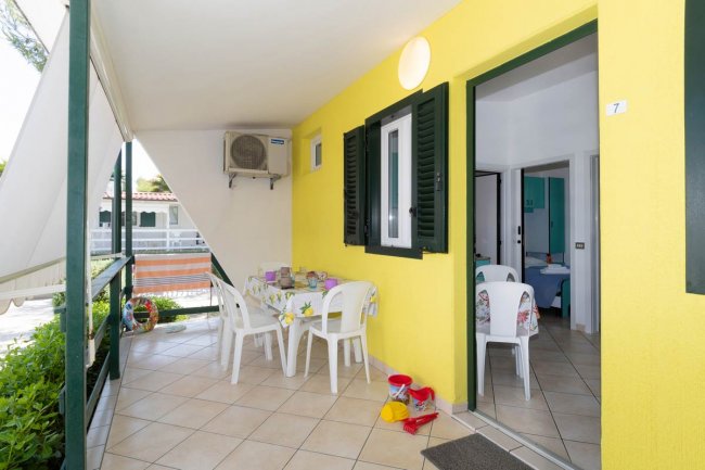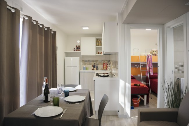 Area giorno con angolo cottura, camera da letto matrimoniale, camera con 2 letti singoli ed 1 a bandiera, bagno con doccia, Tv, climatizzatore e veranda esterna con giardino privato. Il alcune tipologie di Casemobili è presente l'asciugacapelli.