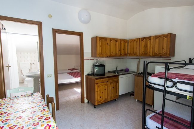 BILOCALI 4 POSTI PRIMO PIANO: Questi appartamenti tipo residence si trovano al di sopra del locale ristorante. Vi si accede da un ampio terrazzo esterno delimitato per ciascun bungalow e attrezzato con tavoli e sedie. All’interno troverete una cucina con letto a castello, una camera matrimoniale e un bagno provvisto di doccia.