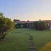 Ampio giardino verde al tramonto, con siepi e sentiero curvilineo.