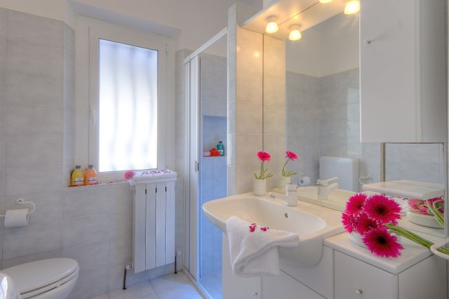 Bagno moderno con mobile bianco, doccia, specchio e fiori rosa.